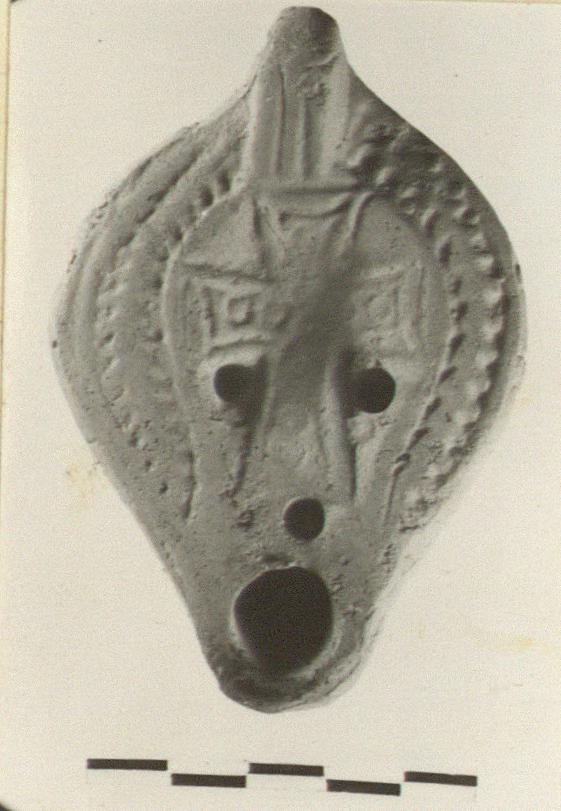 | Description: | Intact. Herringbone on rim; jewelled cross on discus; solid grooved handle. Reverse almond-shaped, with palm branch. Unglazed. Light red clay. Type XXVIII of Corinth collection. | |