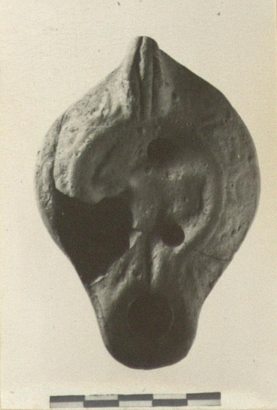 | Description: | Mended from several fragments, complete except small part of top. Unpierced grooved handle. Three filling holes in disc. Bear (?) on discus. Wave pattern on rim. Battered surface. Unglazed. Type XXVIII of Corinth collection. | |