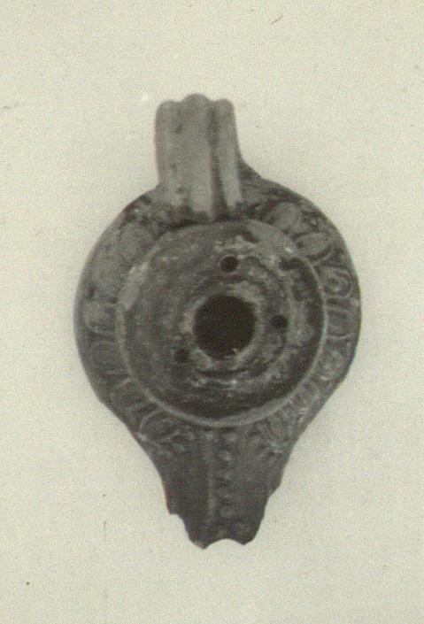 | Description: | End of nozzle broken away. Double convex body with sharp angle between halves. On rim, raised ovolo. Top surrounded by high edge. Filling hole with slightly raised edge with three auxiliary holes. Nozzle, probably triangular; raised dots along top ridge. Wick hole without rim. Vertical ribbed loop. Oval bottom, slightly raised and concave. Dark gray glaze poorly preserved.. Gray clay. Type XIX of Corinth collection. Cf. ArchEph (1902), pl. Η. | |
