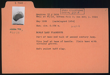 | Description: | Part of base and wall of second century lamp. Vine leaf at base of handle. Plain base with circular groove. Soft yellow-buff clay. | |