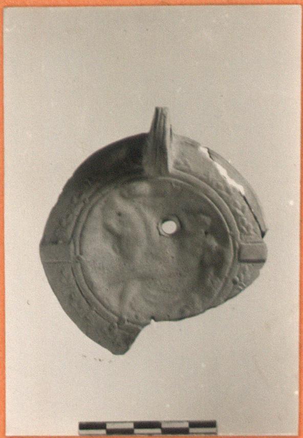 | Description: | Most of disk and handle preserved. Disc decorated with erotic symplegma. On rim, raised pattern and panels. Handle, pierced and grooved. Light gray clay with traces of orange. | |