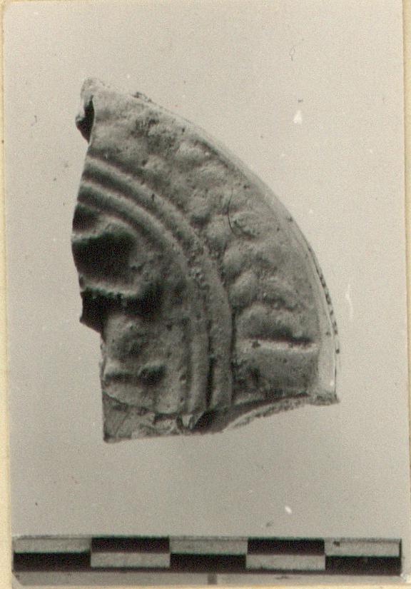 | Description: | Two joining fragments give almost one quarter of lamp. Disc, decorated with double flutes and altar, from scene with Eros playing double flutes. On rim, raised wreath and panel. On base, two bands, first letter of signature partly preserved. Buff clay, with lighter slip. | |