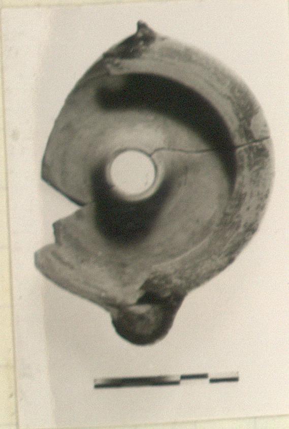 | Description: | Parts of both nozzles, and much of one side missing. Typical central cone, thin fabric, and insloping rim. Red glaze, mostly peeled off on rim and floor only. Nozzles much blackened from use. Type 19A of Agora collection. ADDENDA At least one other of this type in tray. | |