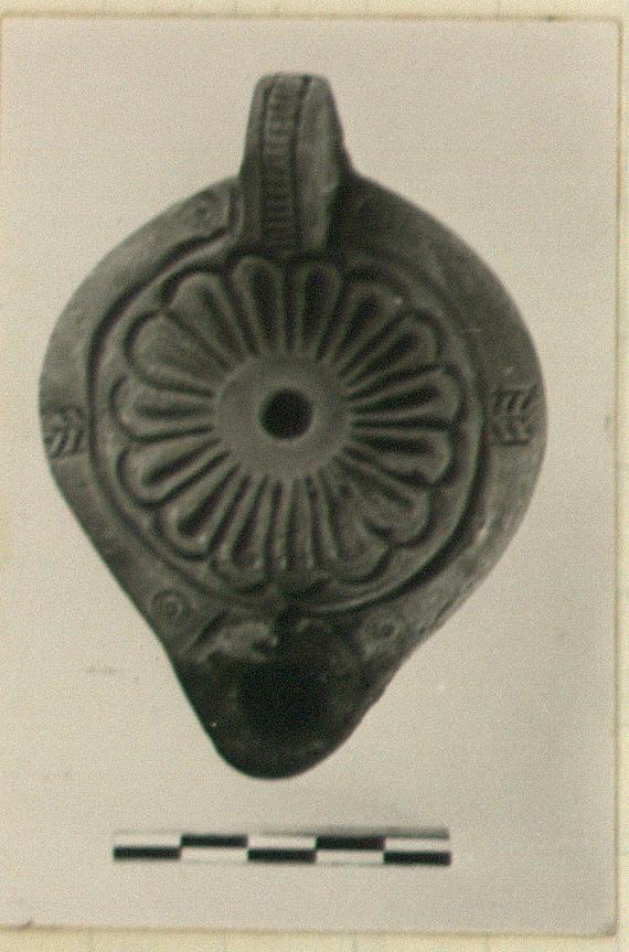 | Description: | Intact. Discus decorated with rosette, framing groove. On rim, panels, four small circles. Handle, unpierced, cross strokes between grooves above, two grooves below. Reverse, "KY" within single groove. Purplish glaze. Type 28 of Agora collection. | |