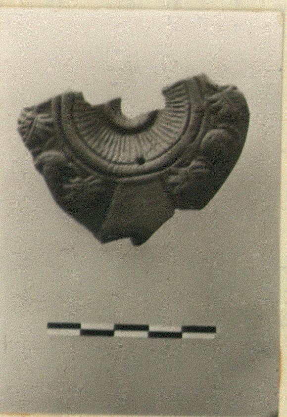 | Description: | Part of top preserved. Discus, decorated with ring rays, framing ring. On rim, vine pattern of six leaves and four clusters. Soft coarse, orange-buff clay. Type 27 of Agora collection. | |