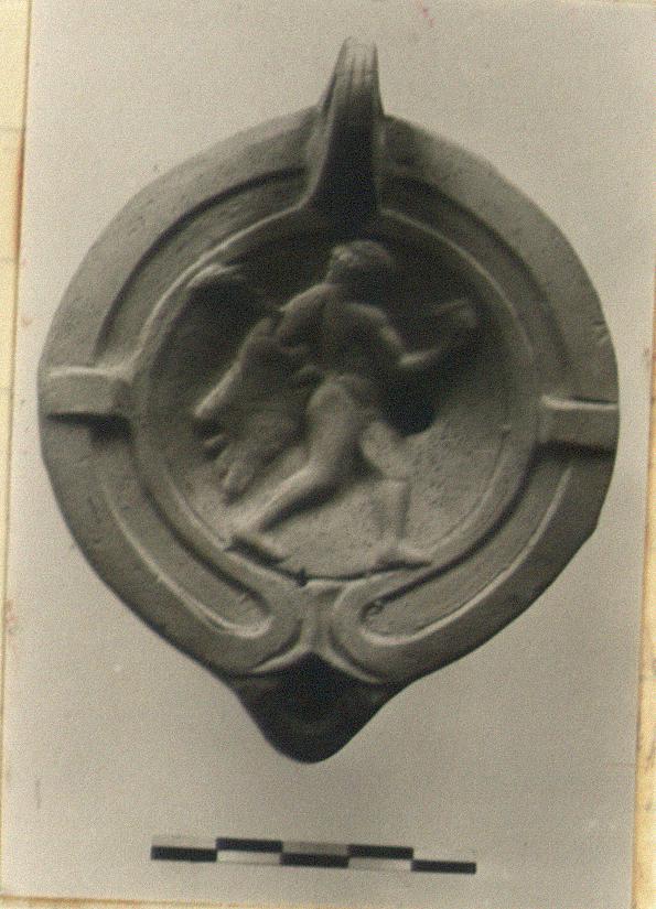 | Description: | Intact. Discus, decorated with reveller (?) to right carrying cup torch and cloak. Rim, plain with panels. Handle, pierced, two grooves above and below. Reverse, within single groove signature "ΤΡΗΤΙΟΥ". Type 27 of Agora collection. Early second century. | |