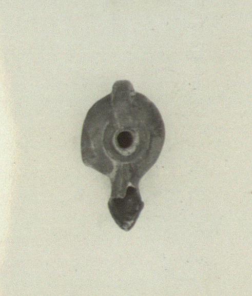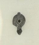 | Description: | Double convex body, the lower half much deeper than the upper; on the left side, a solid, cornucopia-like knob. Very small top, surrounded by a heavy ridge. Long nozzle, rising to a narrow grooved band on top; wide triangular wick hole, broken. High-swung, vertical band handle. Heavy ring base. Fine hard gray clay, with a slip of the same, darker. Type XVIII (?) of Corinth collection, Misc. Moulded type of Agora collection. | |