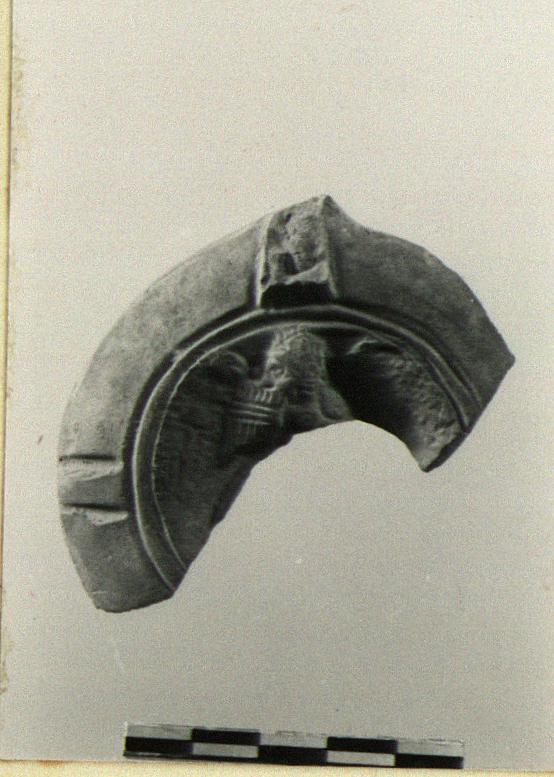 | Description: | About half of the top with handle attachment preserved. On discus, an Eros playing a syrinx. His wings are open to fill the disc. 4th. century. | |