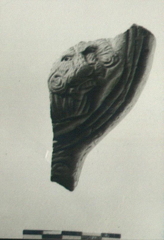 | Description: | Part of rim, wall and nozzle preserved. On disc, head of lion with pierced eyes, from scene of Dionysos bust with kantaros, thyrsos and grape vines. Two framing rings. Plain narrow rim. U-nozzle with scrolls. Glaze entirelly worn off. First half of 4th. century. | |