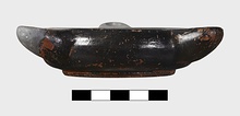 | Description: | Three nozzles equally spaced round low circular body. Low cup in center of infundibulum. Shallow body; slightly rounding; no handle. Very narrow rim, sloping down round extremerly large central opening; slightly chipped. Short nozzles, stubby; flat on top; one nozzle preserved complete; another broken at tip; of the third nothing remains but a break through the body wall at the point corresponding to the other two. Broad bottom, low base. Rather dull black glaze, inside and out and over part of base. Attic clay. Type IV (latest 5th. and early 4th. century group) of Corinth collection, type 21 variants of Agora collection. | |