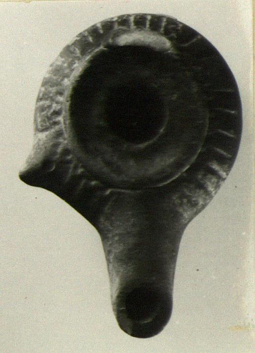 | Description: | Cracked but intact except for missing handle. Slightly raised, concave base, high curved walls, concave top. Moulded rays on upper wall, separated by high ridge from rim. Pierced lug. Reddish to black glaze. Type 46E of Agora collection. | |