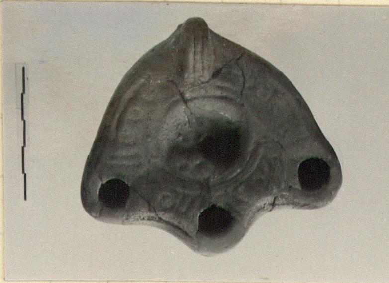 | Description: | Broken in many fragments. Partly restored in plaster. Depressed disc, double framing ring. On rim faint panels and circles. Handle grooved and solid. Base has double groove outlining edge and short parallel grooves on one half. Reddish clay. | |