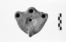 | Description: | Broken in many fragments. Partly restored in plaster. Depressed disc, double framing ring. On rim faint panels and circles. Handle grooved and solid. Base has double groove outlining edge and short parallel grooves on one half. Reddish clay. | |