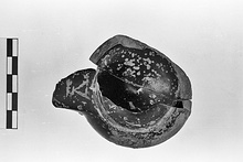 | Description: | Mended from many fragments; incomplete. Vertical band handle broken away. Thick watch-shaped body, tending to double convex. Long, pointed nozzle, rounded on top. On the right side of the body, a small, solid dolphin-shaped knob; on the left side, a similar knob, cornucopia-shaped. Base rising in center; resembling low ring foot. Metallic glaze, peeled in part; over all. Attic clay. Type XI (Agora version) of Corinth collection, type 43A of Agora collection. ADDENDA Lamps L 551 to L 559 found together. A number of fragmentary lamps from the same pithos have been boxed separately, along with the finer sherds. See also pottery 589-630. Strongly resembling in shape, clay, glaze, knobs on sides, etc., the mold made lamps of type XVIII, found with it. See L 551-553. | |