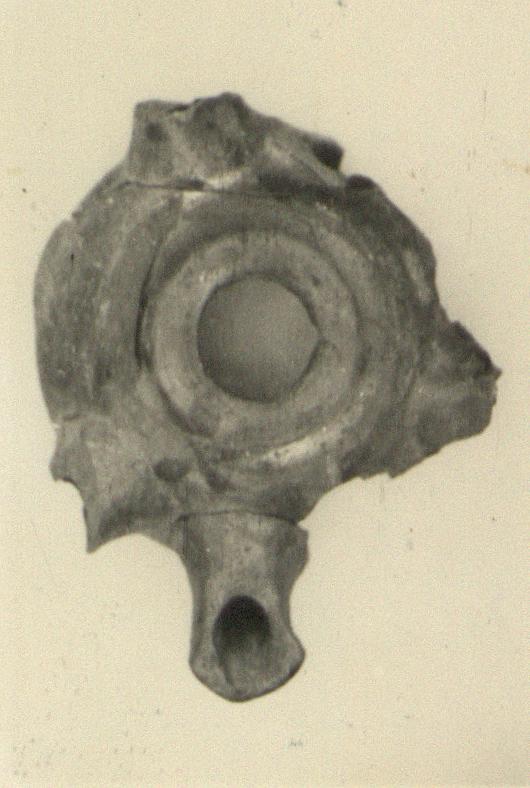 Nozzles set at irregular intervals round the circular body of the lamp; the single nozzle completely preserved is rather short, rounded on top, with irregularly fluked tip and large wick hole.