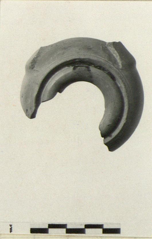 | Description: | Preserved is about two-thirds of body without base and nozzle. Strap handle missing. Globular body, deep groove between body and rim, which slopes inward. Concentric shallow grooves just outside deep groove of rim. Some black glaze on inside. Pale orange clay. Type 25A' of Agora collection. Cf. Agora IV, type 25A'. | |