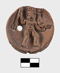 On discus, Poseidin facing; large dolphin in left hand; small trident in right; crude linear ("gouged") technique.