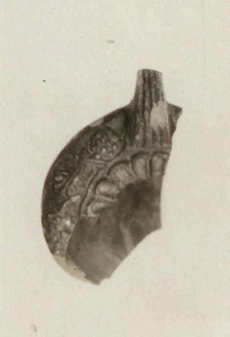 Handle solid; triple grooved above, double below, with debased heart-shaped motif at bottom.