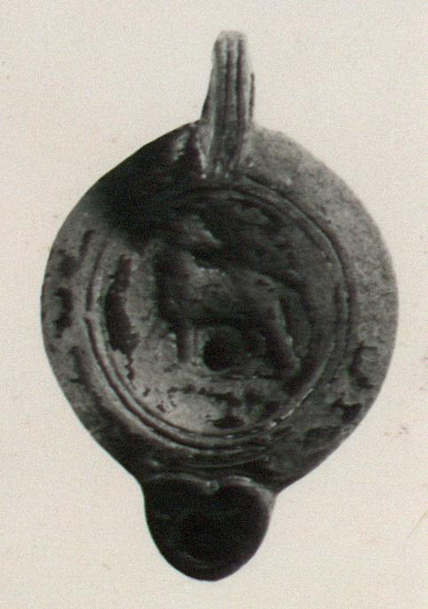| Description: | Complete though very worn. Round lamp with deep concave disk within which is a horse walking left, the head turned back to the right. Full-hole under the horses' stomach. Sloping rim offset from the disk by two incised lines. Thin pierced handle, grooved on top. Moderately large rounded nozzle. Reddish black glaze almost completely eaten away. Red clay. | |