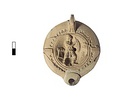 On discus, on top part, bearded figure in tunic, boots and small cap, facing right, holding shield before him. Filling hole on center right, between figure and shield; air slit near front edge. In the field around the figure, to the left, a corselet; to the right, a crested helmet and a pair of greaves.