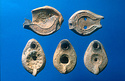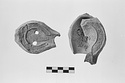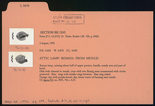| Description: | Lamp, missing about half of upper portion, including handle and nozzle area. Disc with channel to nozzle, cross with two flaring arms ornamented with circles preserved. On rim, rings with smaller rings between. Base ring raised. Attic lamp; from mould. Orange clay with purple-brown slip, heavy traces of burning near nozzle. Cf. Agora VII, no. 2921. Dated 7th. century A.D. | |