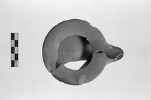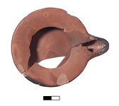 | Description: | Mended from three pieces, chips and fragments missing from body and nozzle. Concave pattern, rounded body, flat rim overchanging slightly. No handle. Black glaze fired orangey-red, burning at nozzle. Type 16B of Agora collection. Cf. Agora IV, nos. 95, 96. 500-480 B.C. | |