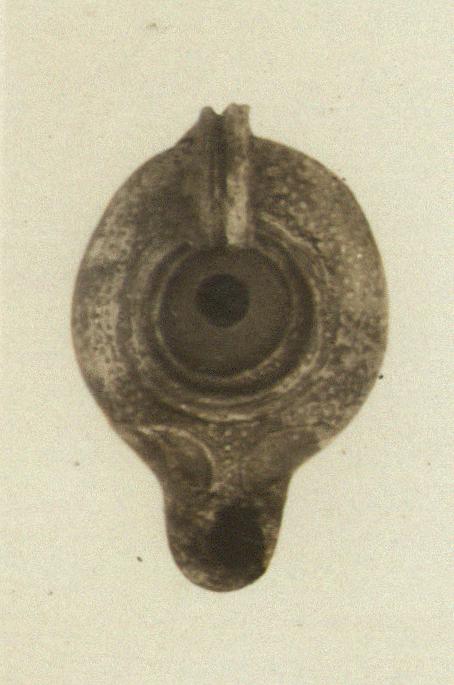 | Description: | Rim and body covered with small globules. Plain discus, concave, with ridges round outer edge. On nozzle, degenerate volutes affording transition to rim. High vertical handle, grooved. On bottom, narrow raised ring, enclosing large "A". Remains of purplish wash; much blackened. Dark red clay. Type XX of Corinth collection. ADDENDA A ridge, lenghtwise across the bottom half of the lamp, suggests that the mold was cracked before using. | |