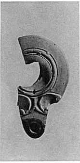 | Description: | Fragment from right side of lamp. Plain, flat rim, set off by two grooves from plain concave discus. Rather long nozzle; pointed, with volutes on rim and a small ridge between. No trace of handle at the back of the lamp. On bottom, deep circular groove, with the letter "K". No trace of glaze. Fine hard pinkish-buff clay. Related to type XXIII of Corinth collection. | |