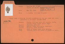 | Description: | Part of lower left side of body missing. Lamp without globules on rim and body but with signature in small raised dots. Discus plain; filling hole off center, left; double ridge round outer edge. Handle pierced, grooved. Typical nozzle, with volutes. On bottom, raised ring, enclosing signature "A". No trace of glaze or wash. Pinkish-buff clay. Type XX of Corinth collection. | |