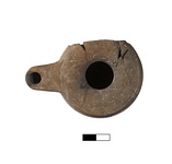 | Description: | Mended from five fragments, part of one side missing. Raised base concave underside with small raised disc in center, interior bottom raises to cone. Nearly vertical wall with slight outward bulge, sharp angle at the junction of the top. Thin groove around the outer edge of the top. Interior coated with think black glaze, exterior with traces of burning. Traces of glaze on exterior? Agora IV, type 25D Prime (late 3rd quarter 4th century into 1st quarter of 3rd century). | |