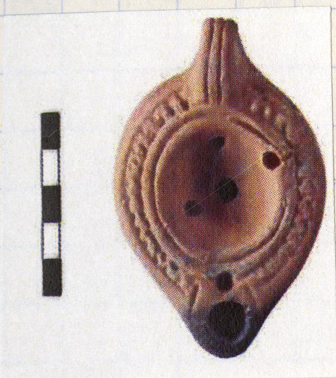 | Description: | Complete. Burnt at nozzle. Concave disk, plain, with three asymmetrical holes around central air hole; framing band. Herringbone on rim. Sides of nozzle grooved with additional hole behind nozzle. Solid grooved handle. Σω incised on base within almond shaped grooves with small dots. Soteria workshop. First half of 5th c. A.D. Cf. Agora VII, 2712 (L 2547) for letters. | |