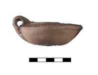 Plain disk with three small holes around central air-hole and extra one close to nozzle. Herringbone rim. Nozzle flanked by groove. Pierced, grooved handle.