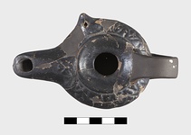| Description: | Mended from many fragments; the vertical band handle, and small pieces from the body, missing. Small depressed top; double convex body, on the upper part of which is an egg and dart pattern in relief. On the nozzle, next the edge of the top, a five petalled rosette. Tapering nozzle, rounded at end; pointed, pierced knob on left side of body. Good metallic black glaze inside and out. Type XVIII of Corinth collection, type 46B of Agora collection. | |
