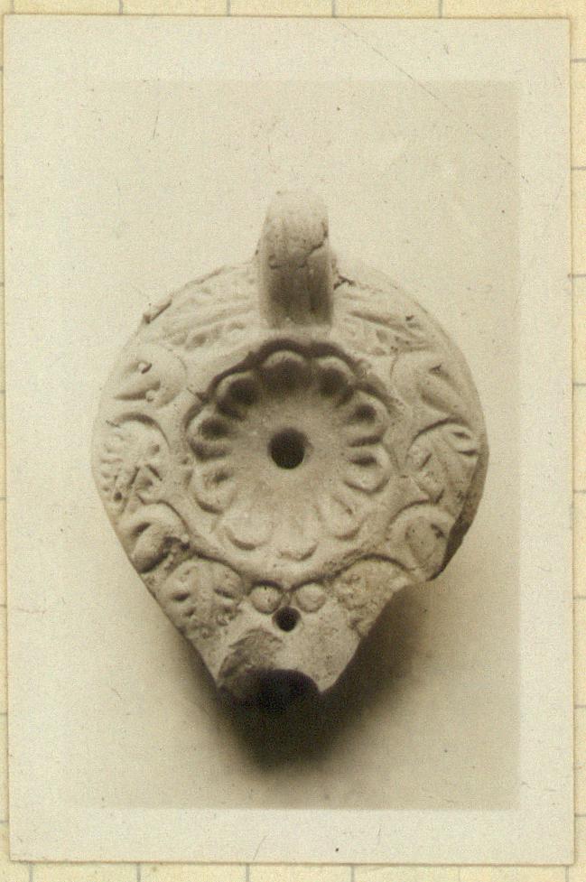 | Description: | Complete save for tip of nozzle and adjacent right side. Rosette on discus, vine pattern on rim. Solid handle, double grooved above, single below. Two impressed circles at the base of the handle and three concentric grooves on the bottom of the lamp. Traces of thin purplish-red wash on the top. Type XXVIII of Corinth collection. | |