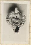 | Description: | Mended from many fragments; a bit of the rim, at the nozzle, and of the rim and body at the back, right, missing. Double spirals, panelled, on rim. On discus, ram left. Handle semi-pierced, triple grooved above, double below. On the under side, within a single circular groove, a large ivy leaf relief, between the letters "E Y". Type XXVIII (early) of Corinth collection. | |