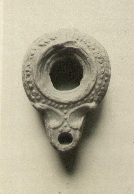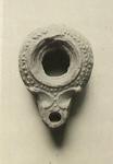| Description: | Handle broken off, otherwise complete and typical, with a large "A" in relief on the reverse. Purplish wash. Pinkish-buff clay. Type XX of Corinth collection. | |