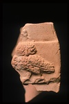 | Description: | Fragment from rim and body. From a large lamp. The rim is plain, with a broad panel, on which is an owl, in relief, left, the head facing. Traces of a thin red wash (?). Light red clay. Type XXVIII of Corinth collection. | |