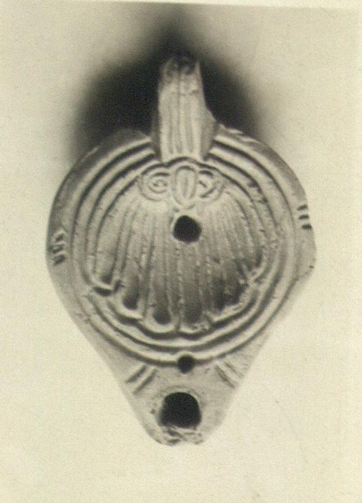 | Description: | Rim plain, panelled with three small gouges on either side. On discus, pectin shell. Solid handle, triple grooved above, double below. On the reverse, within two deep concentric grooves, the letter "A". Purplish-red wash. Coarse red clay. Type XXVIII of Corinth collection. | |