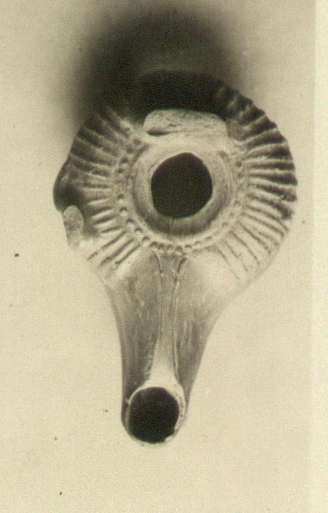 | Description: | Most of the bottom and lower right side broken away, also the vertical band handle. Rounded nozzle; ribs on rim, with row of small dots round central filling hole. Dolphin-shaped knob on left side. Large low ring base. Thin purplish-brown metallic glaze. Type XVIII of Corinth collection, type 48A of Agora collection. | |
