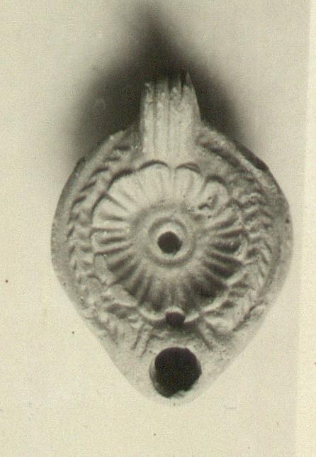 | Description: | On rim, herringbone. On discus, rosette. Solid handle, double grooved above and below. The handle set askew, and the bottom of the lamp dented in making. On the reverse, two circular grooves. Dark purplish-brown glaze wash. Pinkish-buff clay. Type XXVIII of Corinth collection. | |