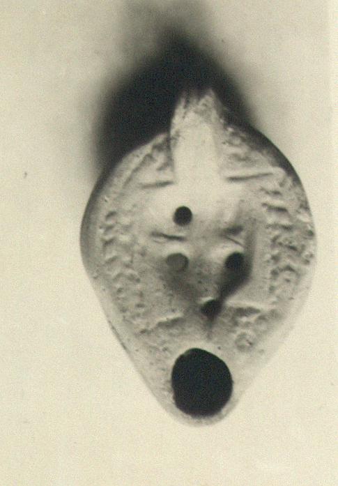| Description: | On rim, herringbone, with circles at handle and nozzle. Discus, square, with a cross, very faint, and four filling holes, three between the arms and one at the base. Handle solid, double grooved above and below. On the reverse, a double almond-shaped groove enclosing a cross; three circles at base of the handle. Unglazed. Coarse pinkish-buff clay. Type XXVIII of Corinth collection. | |