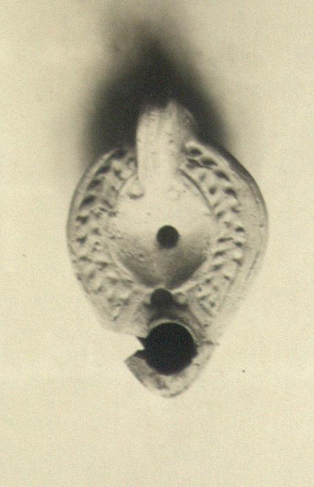 | Description: | The nozzle broken off, but mended; a small bit missing from the left side. On rim, herringbone pattern. Plain discus, with two impressed circles at the base of the handle. Solid handle, double grooved above and below. On the reverse, double almond-shaped grooves; traces of some emblem within. Unglazed. Coarse light red clay. Type XXVIII of Corinth collection. | |