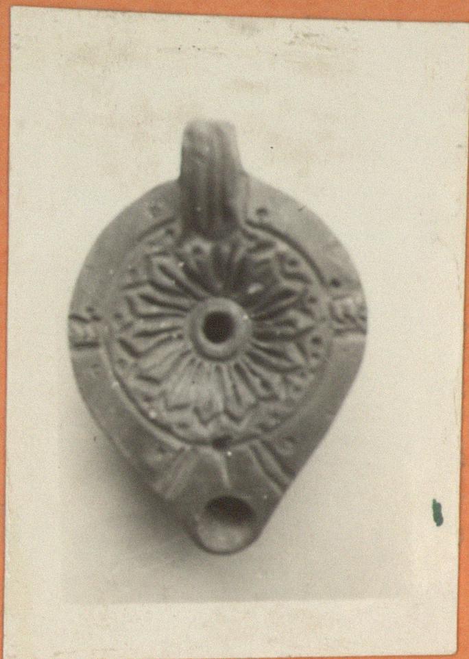 | Description: | On discus, pointed rosette, with stamped circles in the angles. Handle solid, triple grooved. On bottom, double concentric grooves. Brownish-red glaze. Red clay. Type XXVIII of Corinth collection. ADDENDA For rim and nozzle cf. Corinth IV, ii, p. 103, fig. 48, no. 1; p. 105. fig. 49, no. 4. | |