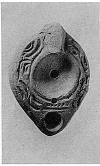 | Description: | Top of handle broken off; below, four coarse grooves. On rim, wavy lines, with a row of six small dots at the neck. Irregular diuble almond-shaped groove on reverse, enclosing a palm branch set diagonally, with three small impressed circles on one side of it and two more on the other, and two outside the grooves at the base of the handle. Unglazed. Light red clay. Type XXVIII of Corinth collection. | |