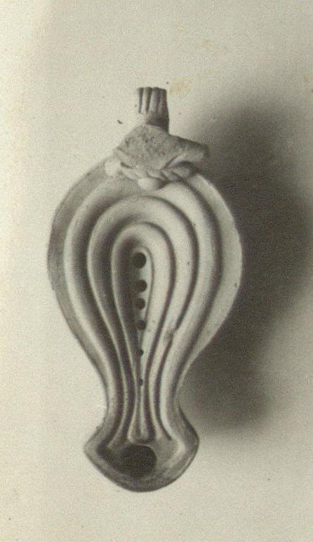 Series of loops in relief with outlet toward triangular nozzle. Six filling holes of size decreasing toward nozzle.