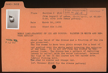 | Description: | Fragment of rim and discus. About one third of the discus and a fraction of the rim are preserved. The rim seems to have been plain except for a band of red applied over the white paint covering the exterior of the lamp. It is set off from the discus by two raised lines. The discus has a pattern of radiating leaves in relief, with the veins indicated; between the tips of two of the leaves are two raised dots. Central filling hole. The clay is coarse and orange-red. Type XXVIII (?) of Corinth collection. ADDENDA For the discus cf. Corinth IV, ii, no. 1085. | |