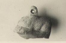 | Description: | Lamp in shape of hare. The base and part of the right side of the animal missing. No indication of the nozzle. The hare is crouching and nibbling at something held between his front paws. That the object is a lamp is indicated by the perforated suspension handle above the animal's ears, by the beginning of the filling hole in front of him, between his paws, and by the glaze on the inner surface of the filling hole. Red slip outside and also inside near the filling hole. ADDENDA Another example of the same type of object: cf. T 424. | |