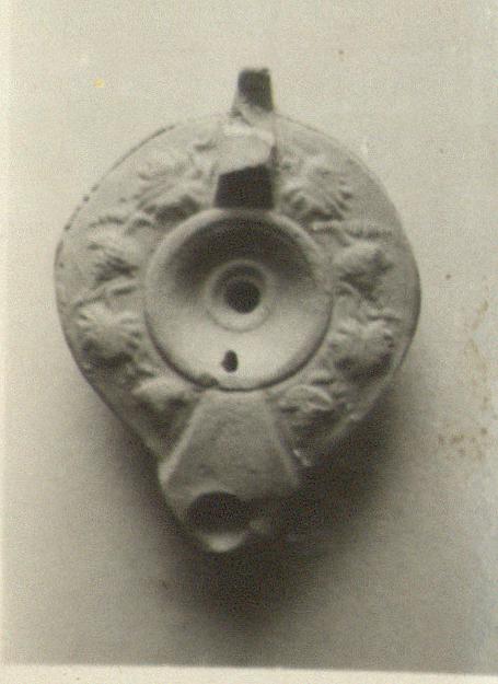 | Description: | Handle broken away. Pattern of alternating grapes and leaves on rim. Discus with rays, triangular nozzle. On the reverse, incised circle and signature:"ΕΥΚΛΕΙΔΟΥ". Unglazed. Slight traces of burning at nozzle. Buff clay. Type XXVII of Corinth collection. <graphic> | |