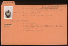 | Description: | Nozzle chipped. Pattern of vine leaves and grapes on rim, plain discus. Pierced handle, triangular nozzle. Raised ring edges base. Unglazed. Greenish clay. Type XXVII of Corinth collection. | |