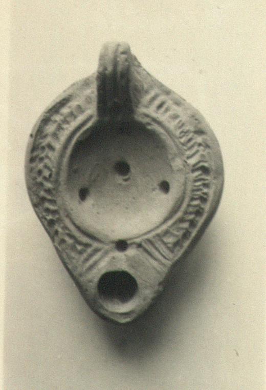 | Description: | Convex side. Herringbone on rim. Plain discus, with three filling holes. Solid handle, grooved. On reverse, within double heart-shaped bounding line, and above inverted pyramid of circles: "EΠΙ". Unglazed. Buff clay. Type XXVIII of Corinth collection. | |